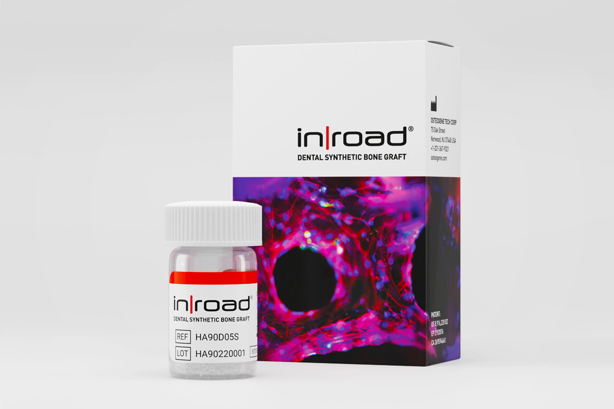InRoad®is an osteoconductive, bioceramic bone graft for dental applications designed to fill bony defects and voids. InRoad®is composed of 90 ± 5% hydroxyapatite (HA) and 10 ± 5% β-Tricalcium Phosphate (β-TCP) in a semi-dense, multi-porous structure.